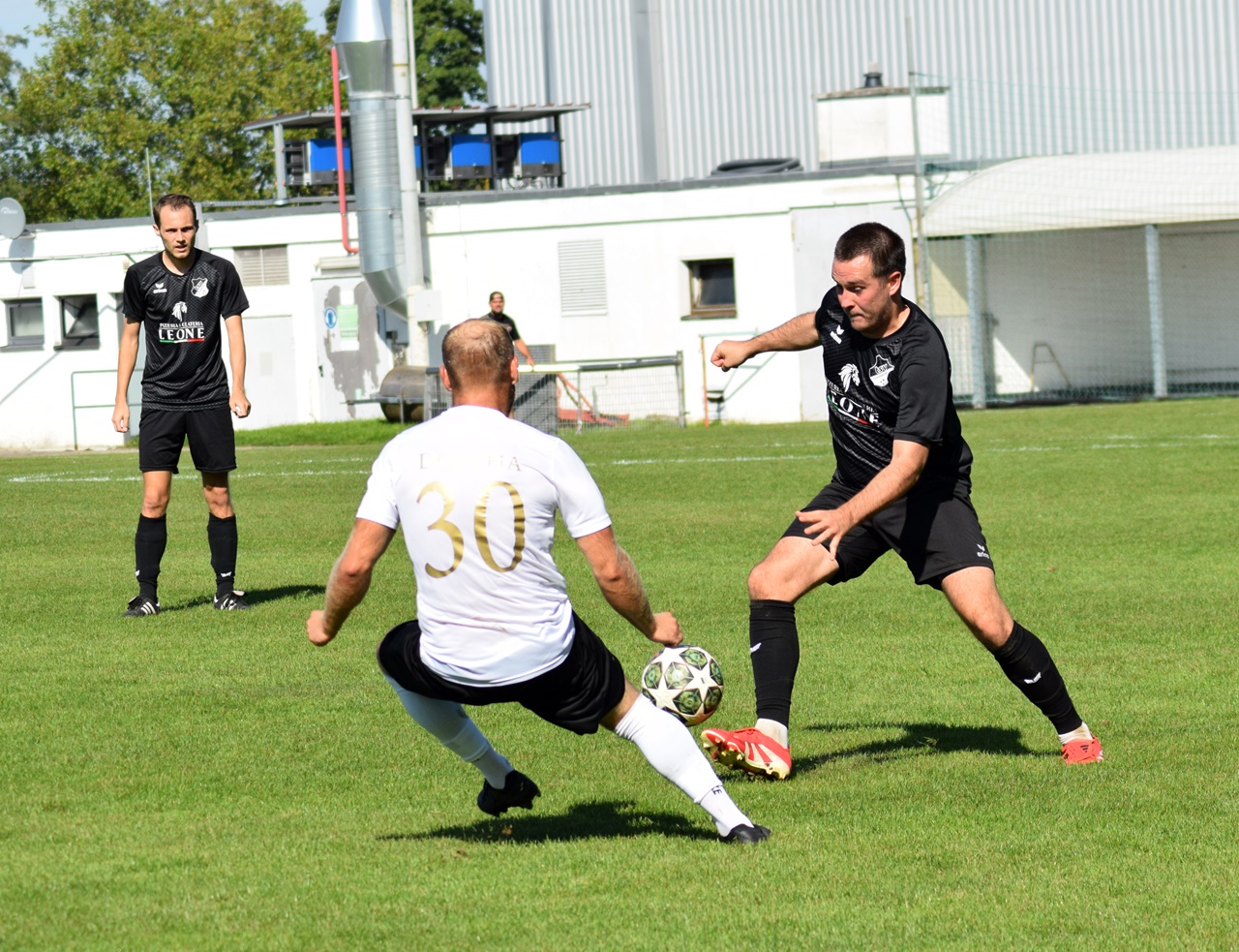 Doch auch unser Team setzte erste Nadelstiche. In der 10. Minute setzte sich Rafael Klotz über rechts durch und spielte einen perfekten Steckpass auf Alexander Bentz, dessen Abschluss im letzten Moment geblockt wurde. Die Partie war von Beginn an intensiv und zweikampfbetont, Gold-Blau suchte immer wieder mit Chipbällen hinter die Abwehr den Weg zum Tor.