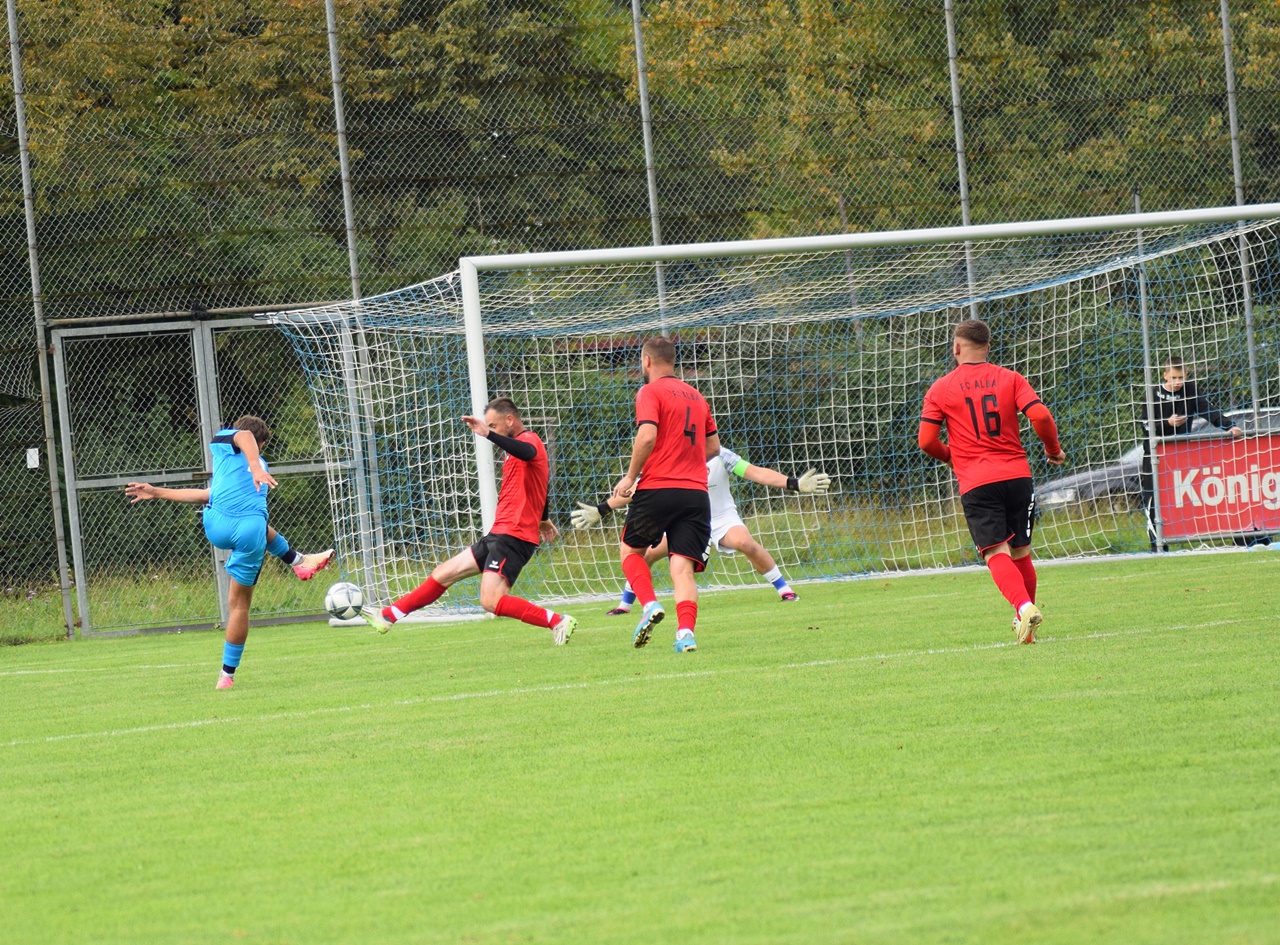 Der Start ins Spiel verlief denkbar schlecht. Schon in der sechsten Minute geriet unsere Mannschaft in Rückstand. Ein Freistoß von Spielertrainer Ermal Gega flatterte gefährlich auf das Tor. Torhüter Tim Sailer konnte den Ball nur abklatschen, und Enver Fazlija staubte zum frühen 0:1 ab. Es passte zum schwachen Beginn, denn in der ersten halben Stunde fand unsere Mannschaft kaum Zugriff. Immer wieder versuchte man es mit langen Bällen, die jedoch selten ihr Ziel fanden. Auch ALBA konzentrierte sich fast ausschließlich auf hohe Bälle und Konter, die unsere Abwehr meist abfangen konnte.